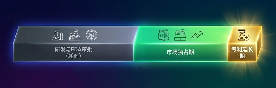 - 对原研药的补偿:为了弥补因监管审批而损失的专利寿命,法案提供了“专利期延长”机制,可以将部分在临床试验和FDA审批中流逝的时间加回到专利有效期上(最多不超过5年,且总有效专利期不超过14年)。