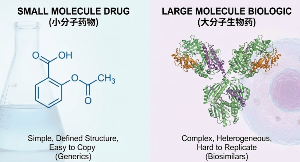 然而,药物世界并非单一维度的。我们既有经典的化学合成“小分子”药物,也有日益崛起的生物制造“大分子”药物。这两类药物在结构上的天壤之别,注定了它们在专利保护的战场上,有着截然不同的战术与博弈。