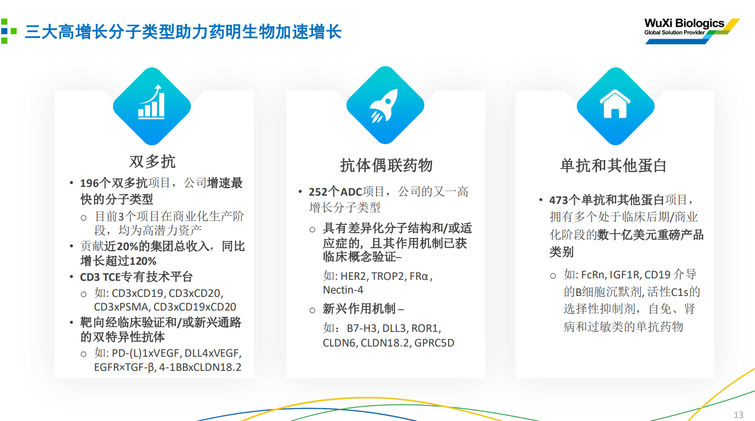 研发管线涵盖各类生物药,其中双多抗项目数为196个,同比增长30%;3个项目在商业化均为高潜力资产,临床III期项目9个;双多抗收入占比近20%,同比增长超过120%,是公司增速最快、盈利能力最强、最精彩的分子类型。
