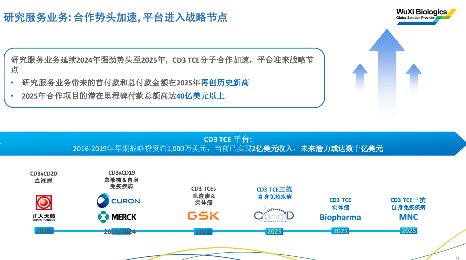 研究服务业务:CD3 TCE分子合作加速,平台迎来战略节点。当前已实现2亿美元收入,2025年首付款和总付款金额创历史新高,2025年合作项目的潜在里程碑付款总额高达40亿美元以上。