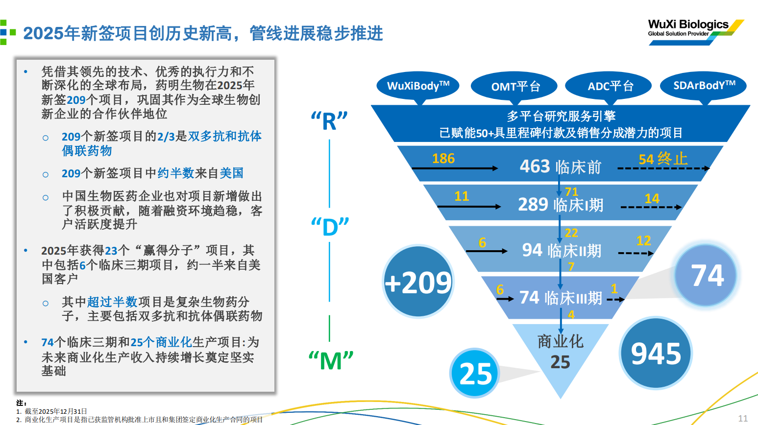 药明生物在2025年新签209个项目,同比增长38%,其中2/3是双多抗和抗体偶联药物。在这些新签项目中约半数来自美国;截至2025年末商业化项目25个、III期项目74个。
