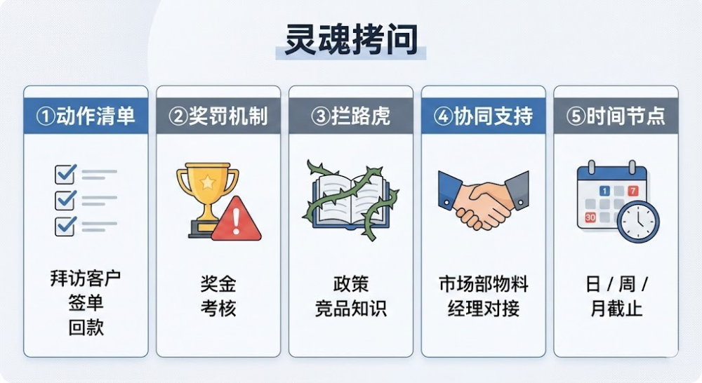 你需要把“我们要达成什么目标”转化为“我们每天要做什么动作”。这需要你的团队回答以下五个灵魂拷问: