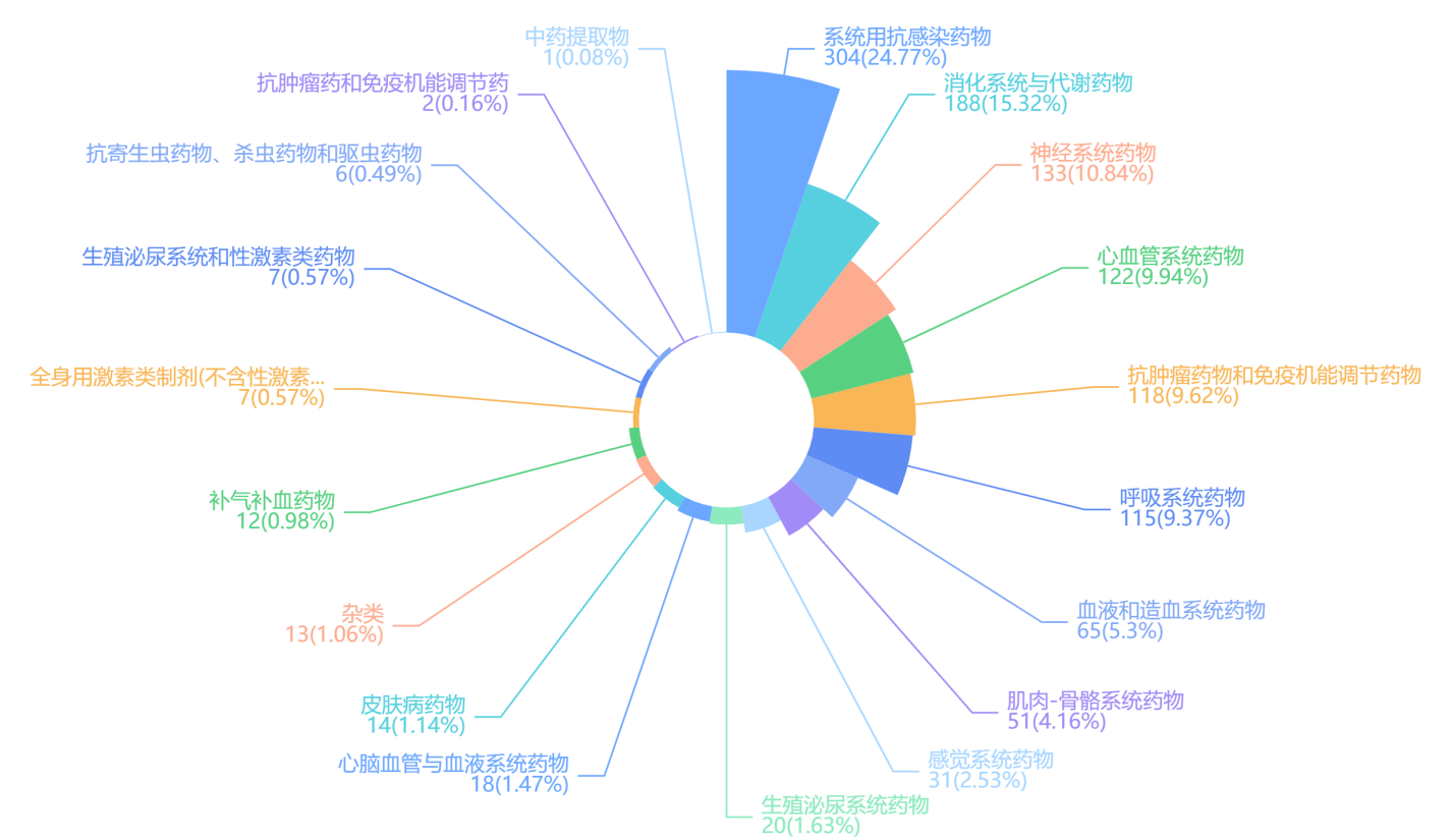 据摩熵医药数据库(企业格局数据库)最新统计显示,石药集团的业务版图呈现出高度多元化的特征。其产品治疗领域不仅深耕心脑血管与神经系统等传统优势领域,更在抗肿瘤与免疫调节等高增长赛道上占据重要地位。此外,集团在系统用抗感染、呼吸系统以及血液造血系统等多个细分治疗领域均有成熟布局,展现了强大的综合竞争力。