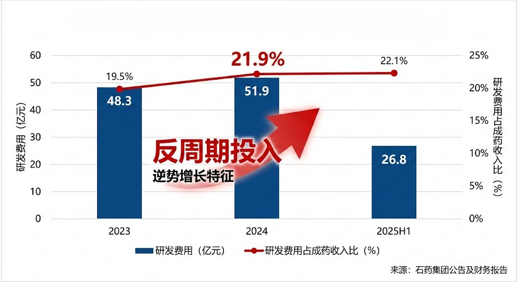 值得注意的是,在业绩承压最重的时刻,石药集团并未削减研发预算。2024年研发费用达到51.9亿元,占成药收入的21.9%;2025年上半年继续逆势增长5.5%至26.8亿元。这种“反周期”的投入策略,虽然在短期内拉低了净利率,却是公司能够在2026年以后实现V型反转的唯一路径。