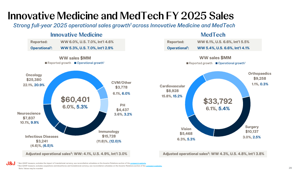 1月21日,强生公布2025年全年财报,财报显示,2025全年营收达到942亿美元,同比增长6%。其中,两大核心业务板块——创新制药和医疗科技分别收入604.01亿美元(+6%)和337.92亿美元(+6.1%)。