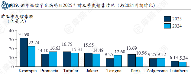 诺华2024年全年营收达503.17亿美元,罕见病药物贡献35%-40%营收,估计总销售额176.1-201.3亿美元。研发管线方面,诺华以132条罕见病研发管线超越辉瑞跃居全球首位,罕见病管线占比高达52%,广泛覆盖肿瘤、神经科学、免疫学等多个关键治疗方向。2025年前三季度畅销罕见病药品销售额与2024年同期相比有所波动。
