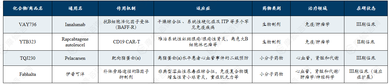 (3)免疫与肾病:Ianalumab(VAY736)针对干燥综合征、免疫性血小板减少症和暖抗体型自身免疫性溶血性贫血已进入III期临床。2025年8月,两项II期临床试验显示此药物在治疗干燥综合征方面取得了积极的顶线结果。