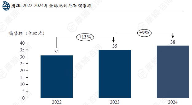 尼达尼布 在勃林格殷格翰2024年总体营收持续增长的前提下,其销售额占总体销售额比例保持不变,显示出 尼达尼布 在勃林格殷格翰所有产品中的重要与潜力。