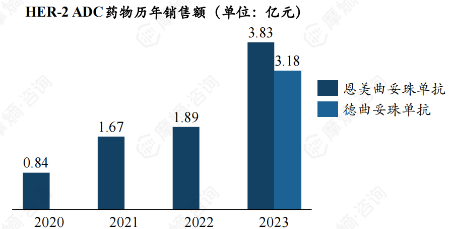 根据摩熵医药销售数据库,恩美曲妥珠单抗自上市后销售增长显著,2023年销售额达3.83亿元;而德曲妥珠单抗第一年销售额即突破3亿元。