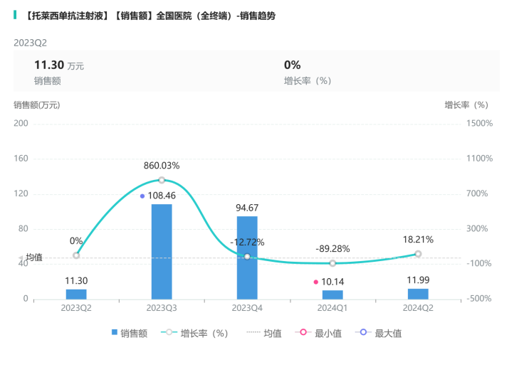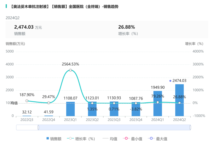 奥法妥木单抗注射液2024年Q2销售额对比2023年Q4增长1365.96万元,增长率为123.27%,两款药在各自治疗市场销售额增长都较为突出。