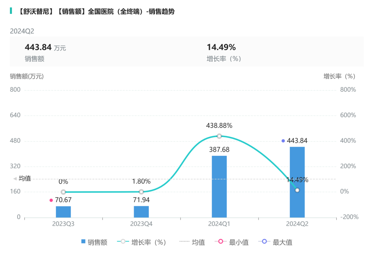 舒沃替尼自上市后销售额持续增长,2024Q2销售额较2023Q2增长373.17万元,2024Q1增长率最大,为438.88%。