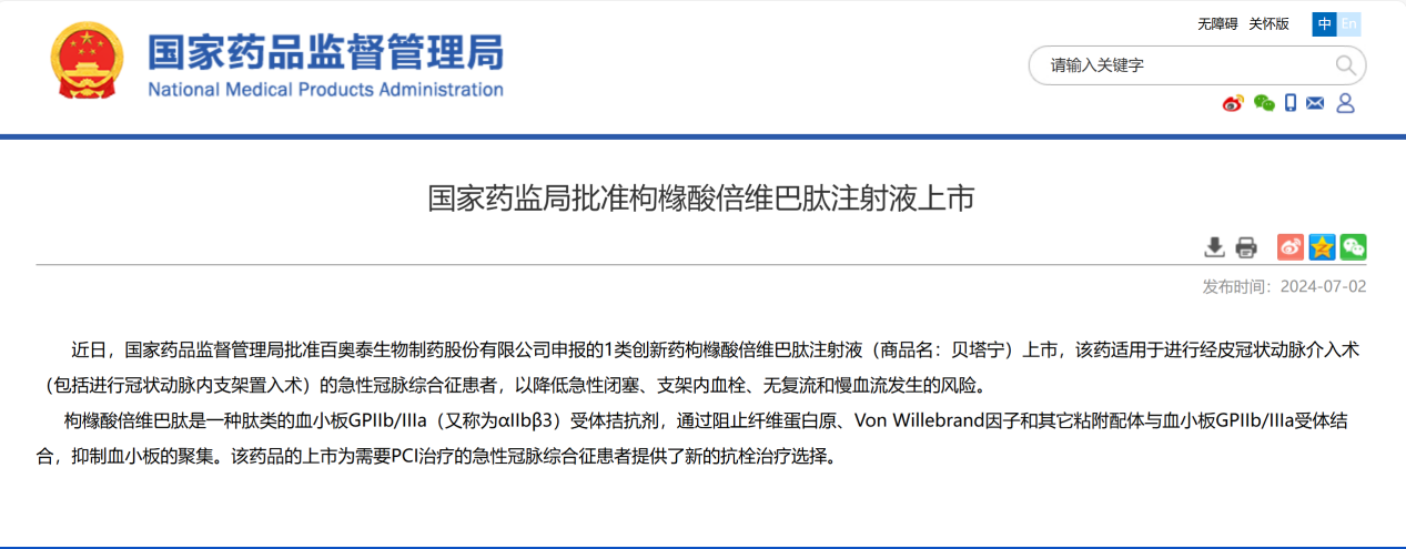 据国家药品监督管理局(NMPA)文件显示,其中枸橼酸倍维巴肽注射液于今年七月刚被批准上市,用于治疗进行经皮冠状动脉介入术的急性冠脉综合征患者。