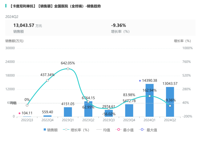 康方生物的卡度尼利单抗在2023Q3销售额增长率最低,为-56.02%,2024Q1增长率最高,为162.94%,销售额14390.38万元。