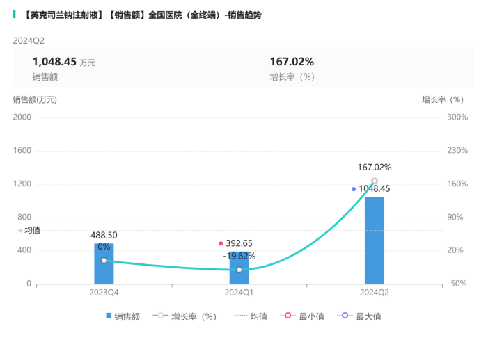 诺华制药的英克司兰钠注射液和奥法妥木单抗注射液在上市后除个别季度销售额略微浮动外,整个市场销售生命线都较为稳定增长。英克司兰钠注射液2024年Q2对比2023年Q4增长559.95万元,增长率为114.63%。