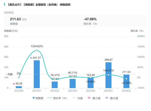 人福医药的氯巴占片销售额浮动较大,刚上市2023Q1和2024Q1增长较高,Q2相对Q1下降较大。总体来看上半年市场情况浮动较大。