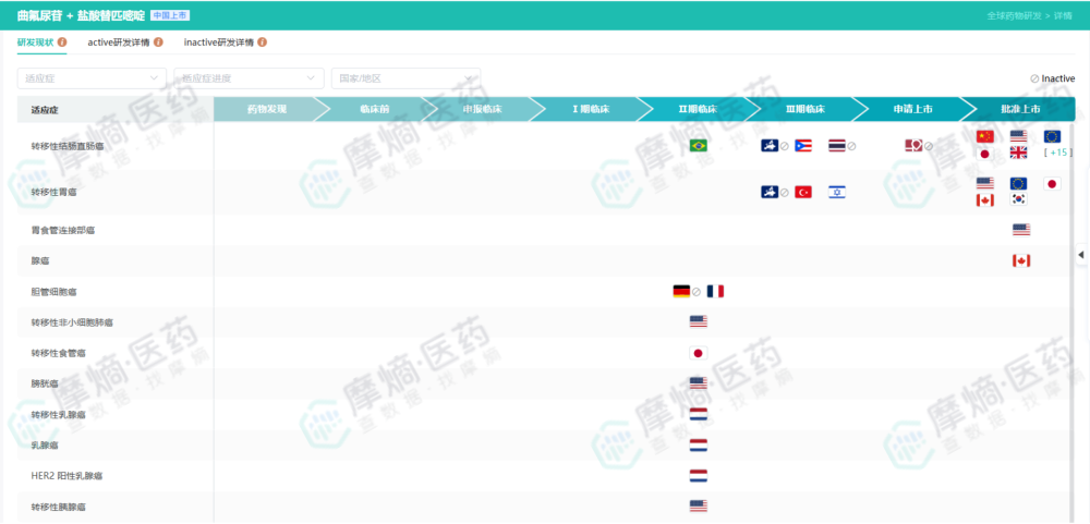 TERRA研究的成功,不仅验证了TAS-102在亚洲人群中的疗效,也直接支持了其在中国等亚洲国家的上市,填补了这些地区晚期结直肠癌后线治疗的空白。事实上,通过摩熵医药提供的‘研发状态表’,我们可以观察到TAS-102在不同国家上市的时间差以及适应症拓展的轨迹,这对于药企规划国际化布局具有极高的参考价值。”