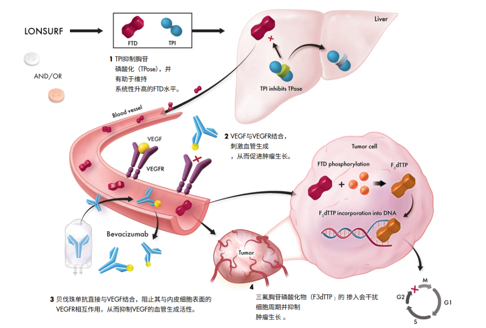 机制互补:TAS-102直接杀伤肿瘤细胞,贝伐珠单抗切断血管供应,同时TPI本身也有抗血管作用,三者形成了全方位的封锁。