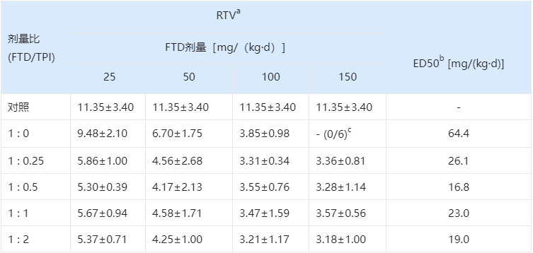 实验结果显示,单用高剂量FTD虽然能抑制肿瘤,但会导致小鼠因毒性死亡。而1:0.5的组合不仅实现了最佳的肿瘤抑制(RTV最小),且小鼠耐受性良好。