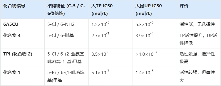 研究团队以 6-氨基-5-氯尿嘧啶(6A5CU)为先导化合物,开启了漫长的结构修饰之路。6A5CU对人TP有一定的抑制作用,但活性不够强(IC50为1.5 ×10-5mol/L),且缺乏选择性,同时抑制UP 。