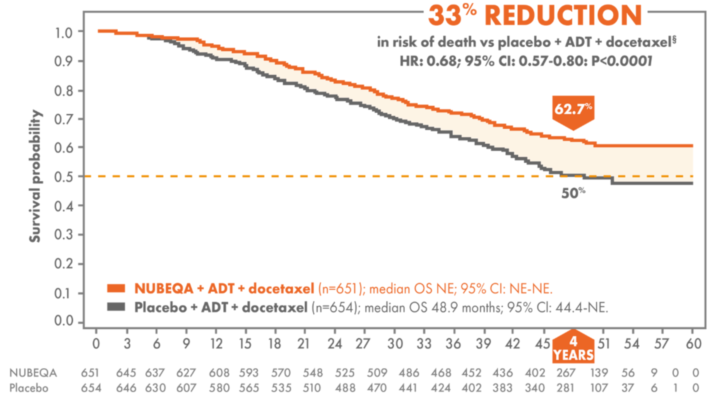 - 临床突破:Nubeqa 在ARASENS试验中表现出色,联合 多西他赛 治疗转移性激素敏感性前列腺癌(mHSPC)显著降低了死亡风险。2025年,基于ARANOTE试验的积极结果,Nubeqa 进一步巩固了其在前列腺癌全病程管理中的地位。