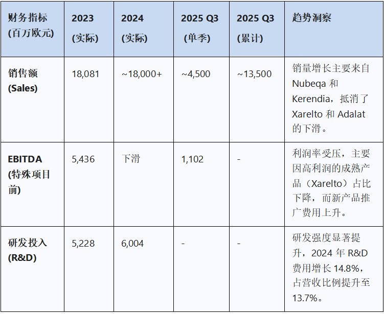 营收趋势:2024年集团销售额约为476亿欧元,受汇率逆风影响,报告数据同比下降,但在汇率及资产组合调整后实现了微增。进入2025年,前三季度集团销售额达到341.37亿欧元,调整后同比增长0.5%。其中,制药部门在面临Xarelto专利过期的巨大压力下,Q3销售额仍与去年同期持平(调整后),显示出新产品放量对冲了老产品下滑。
