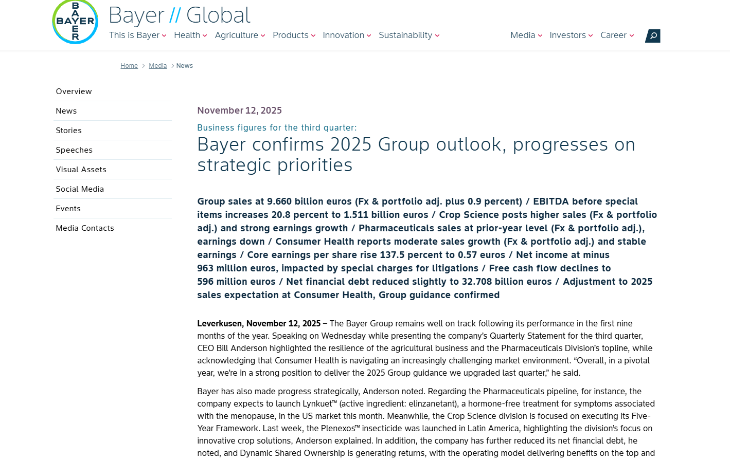 2024至2025年是拜耳财务表现极具挑战的时期。集团面临着“完美风暴”:农业板块的周期性低谷、制药板块的专利到期以及持续不断的法律诉讼支出。