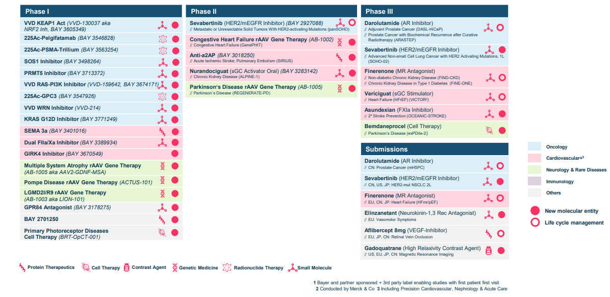 拜耳的研发策略已从过去的“封闭式创新”彻底转向“开放式创新”与“技术平台驱动”。截至2025年底,拜耳拥有约30+个临床开发项目。