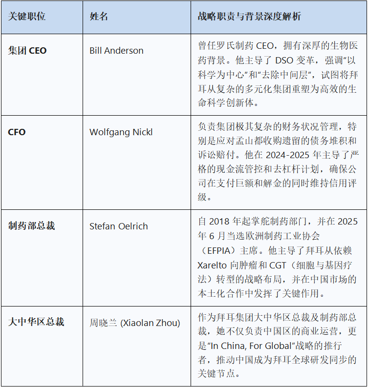 截至2025年底,拜耳制药的管理团队体现了其全球化与专业化的战略导向: