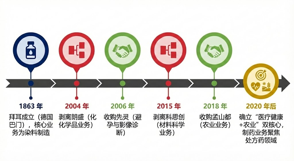 拜耳公司于1863年在德国巴门(Barmen)成立,起初是一家染料制造商。经过一个半世纪的演变,特别是通过剥离朗盛(Lanxess,化学品)和科思创(Covestro,材料科学),以及收购先灵(Schering,避孕与影像诊断)和默克(Merck & Co.,消费者健康部分业务),拜耳确立了其作为全球生命科学巨头的地位,聚焦于医疗健康与农业两大支柱。