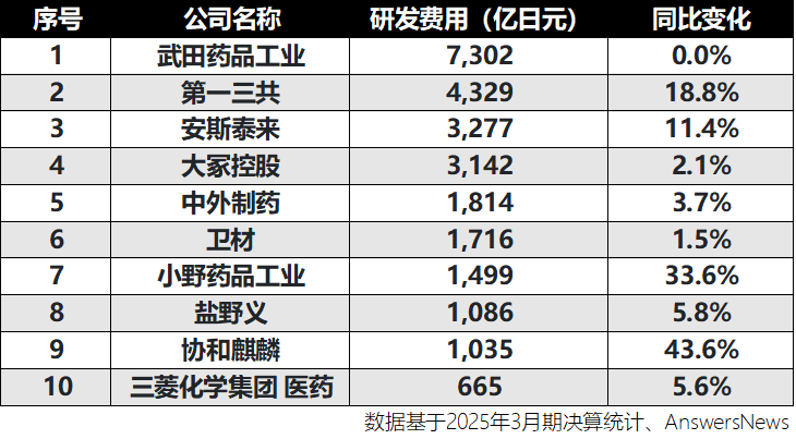 在创新药竞争日益激烈的背景下,研发投入已成为药企未来竞争力的核心指标。2024财年,日本研发支出前十企业合计投入超2.5万亿日元。