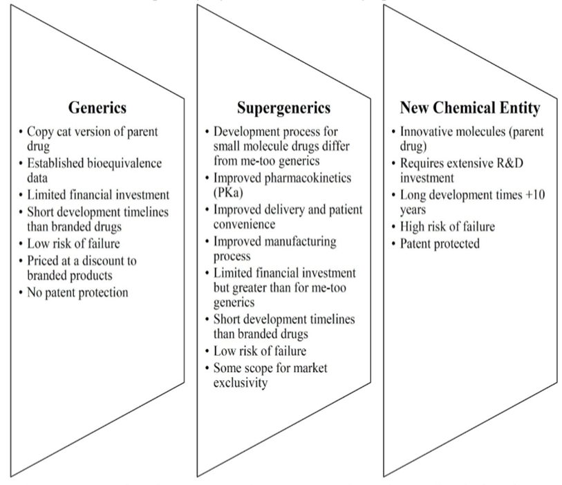 图4. 仿制药、超级仿制药与新化学实体的对比(参考6)