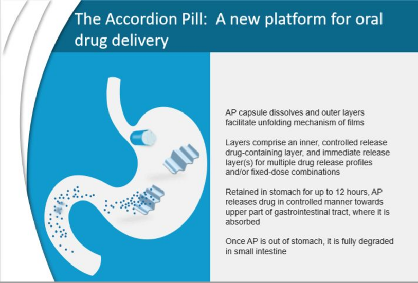 - Accordion Pill™ 技术:一种创新的胃滞留技术,药片在胃中展开成像手风琴一样的多层结构,延长药物在胃肠道上部的停留时间,从而改善吸收。