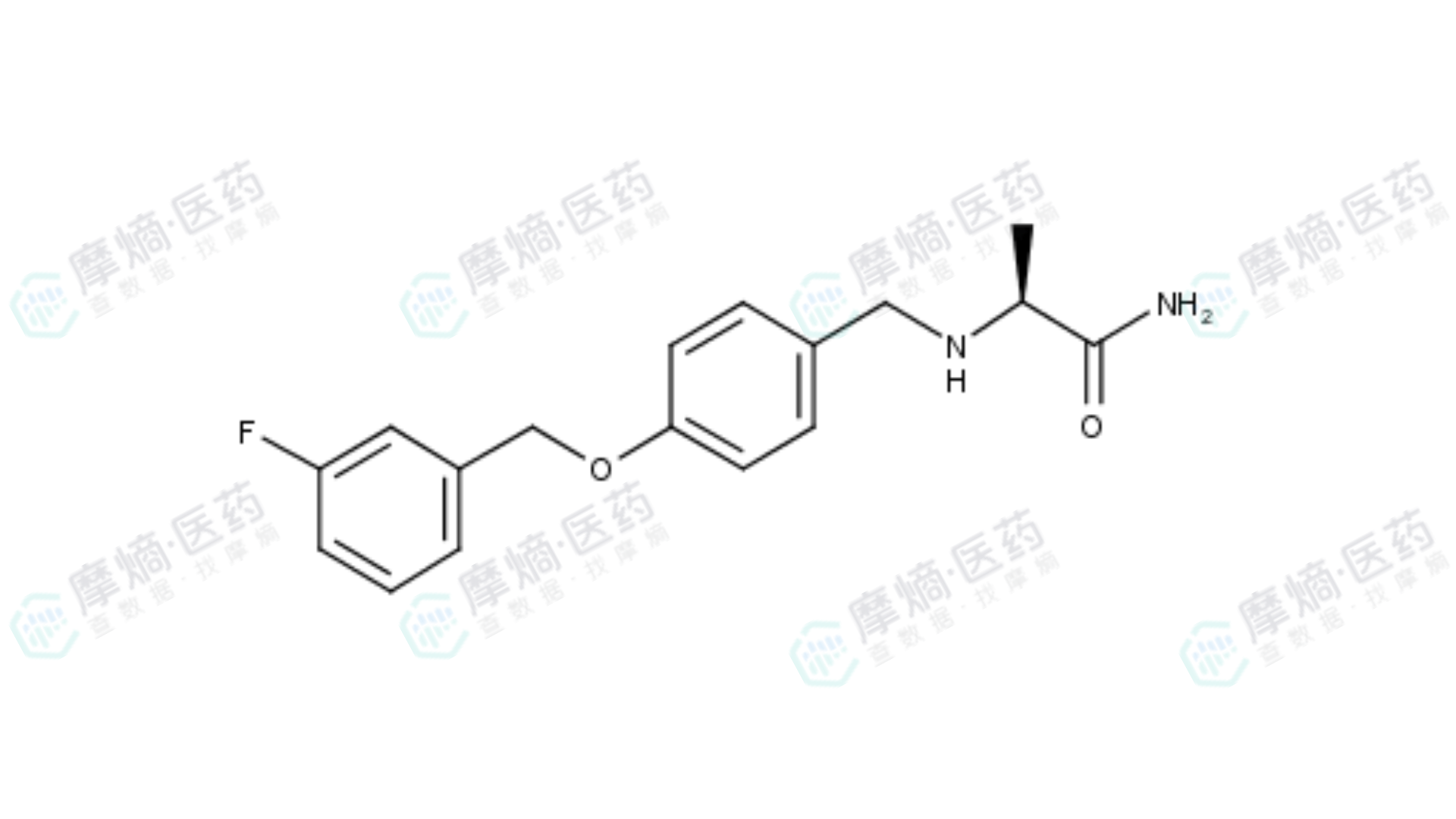 在众多衍生物中,代号为PNU-151774E的分子脱颖而出。它的化学名称是(S)-2-[[(3-氟苄基)氧基]苄基]氨基]丙酰胺甲磺酸盐,即后来的 沙芬酰胺(Safinamide)。