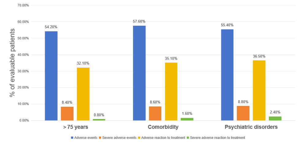 西班牙患者接受沙芬酰胺治疗12个月后,按年龄、合并症和精神状况划分的不良反应百分比