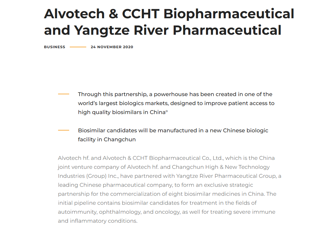 - Alvotech战略合作:扬子江与冰岛生物制药公司Alvotech建立了排他性战略合作伙伴关系。扬子江获得了Alvotech研发的 阿达木单抗(Humira biosimilar)、乌司奴单抗(Stelara biosimilar)等重磅品种在中国市场的独家商业化权益。