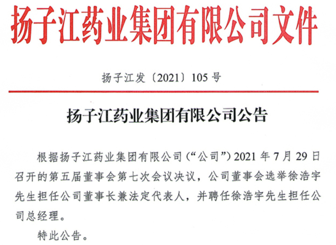2021年是扬子江药业发展史上的重要分水岭。创始人徐镜人去世,其子徐浩宇接任董事长兼总经理。