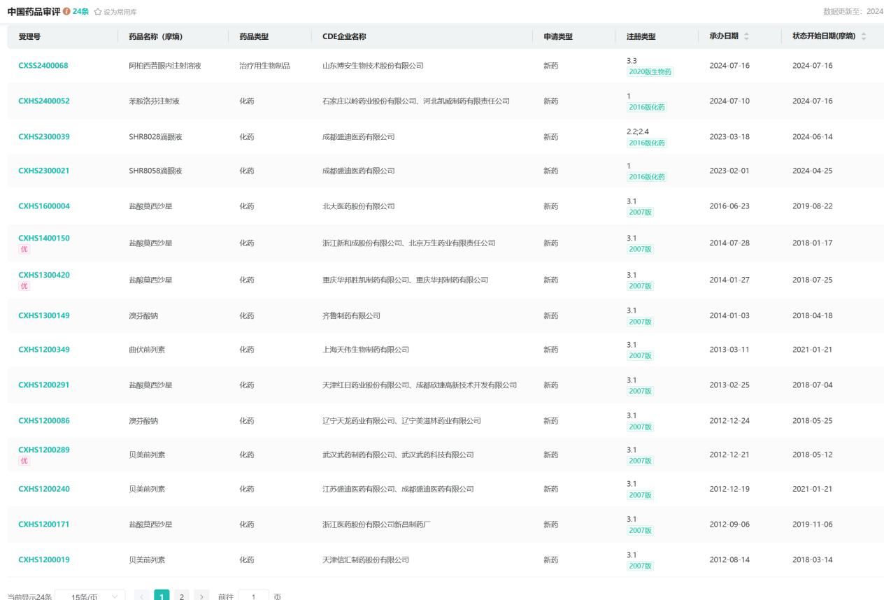 据摩熵医药数据库显示,截止2024年上半年眼科用药已有5个产品(12个受理号)已完成审评,15个产品(24个受理号)正在审评审批中。其中,由成都盛迪医药有限公司提出的对SHR8028滴眼液和SHR8058滴眼液的受理已中途暂停。盐酸莫西沙星最火,有7家企业提交申请;其次是贝美前列素,有5家企业,具体受理情况如下图所示。