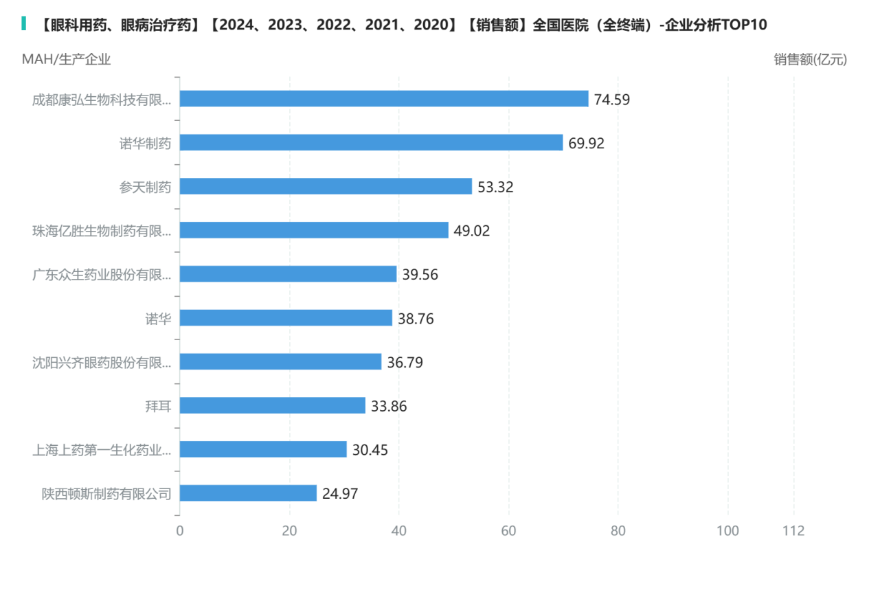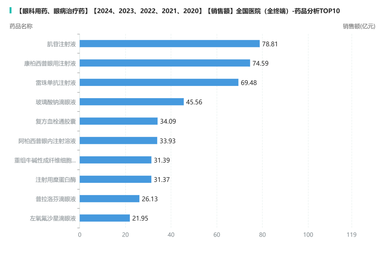 眼科用药品牌TOP10中,上榜的国产品牌有4个,包括康弘药业的康柏西普眼用注射液、陕西顿斯的肌苷注射液、广东众生药业的复方血栓通胶囊、上药第一生化药业的注射用糜蛋白酶。外资品牌包括诺华的雷珠单抗注射液、拜耳的阿柏西普眼内注射溶液、参天制药的玻璃酸钠滴眼液和左氧氟沙星滴眼液以及珠海亿胜的重组牛碱性成纤维细胞生长因子凝胶,占据另外5个席位。康弘药业该领域市场销售额超诺华制药4.67亿元。