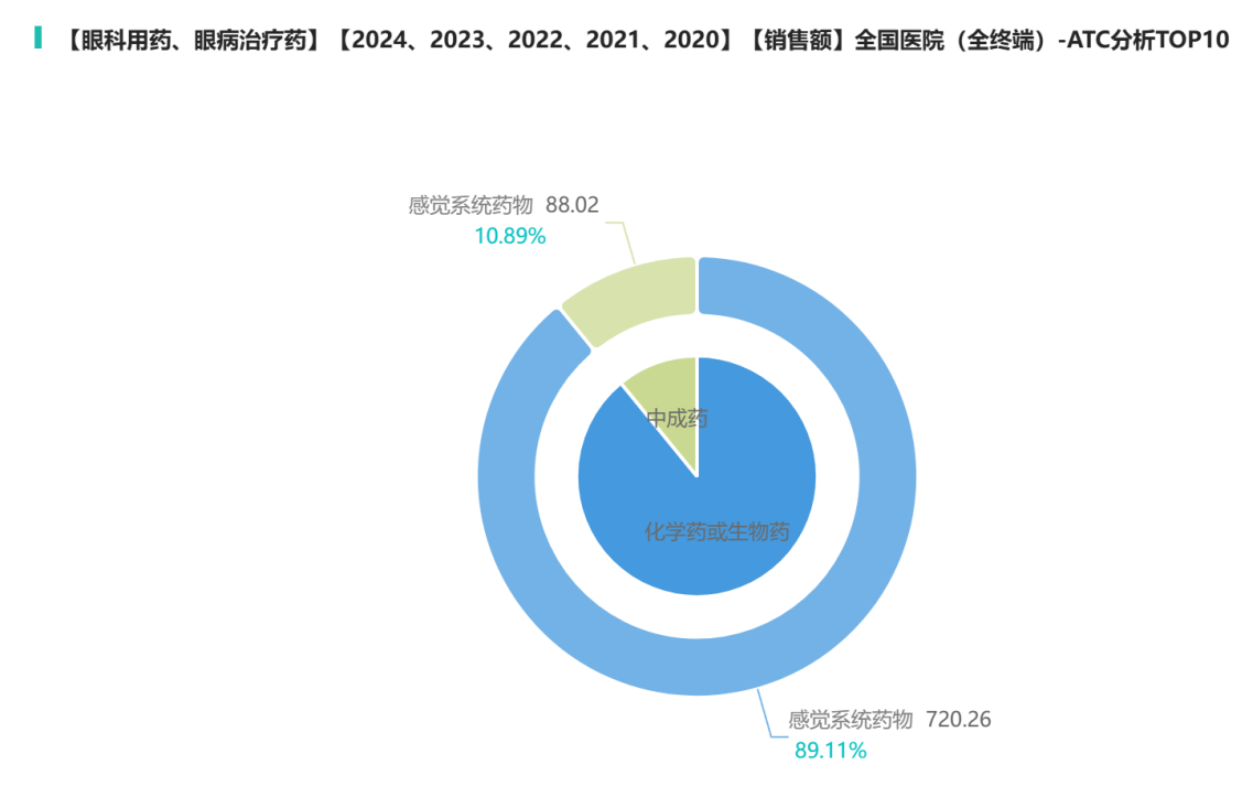 从ATC分类来看,眼科用药主要以化学药或生物药为主,占比近九成。该情况可能是由于眼科疾病种类繁多,针对不同病理机制的治疗方案有多样化需求,而化学药物能够快速达到局部作用效果,生物药针对复杂疾病可提供新治疗选项。且这些药物在安全性和耐受性方面经过广泛研究,适合长期使用,所以市场份额比重较大。