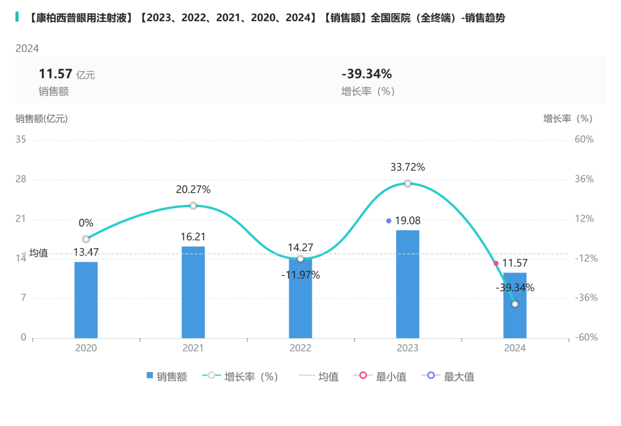 康柏西普眼用注射液主要用于治疗湿性年龄相关性黄斑变性(AMD)。2023年销售增长率最快,为33.72%。值得关注的是,该药2024上半年销售额已达2023年销售额的60.64%,2024年整体销售额可观。