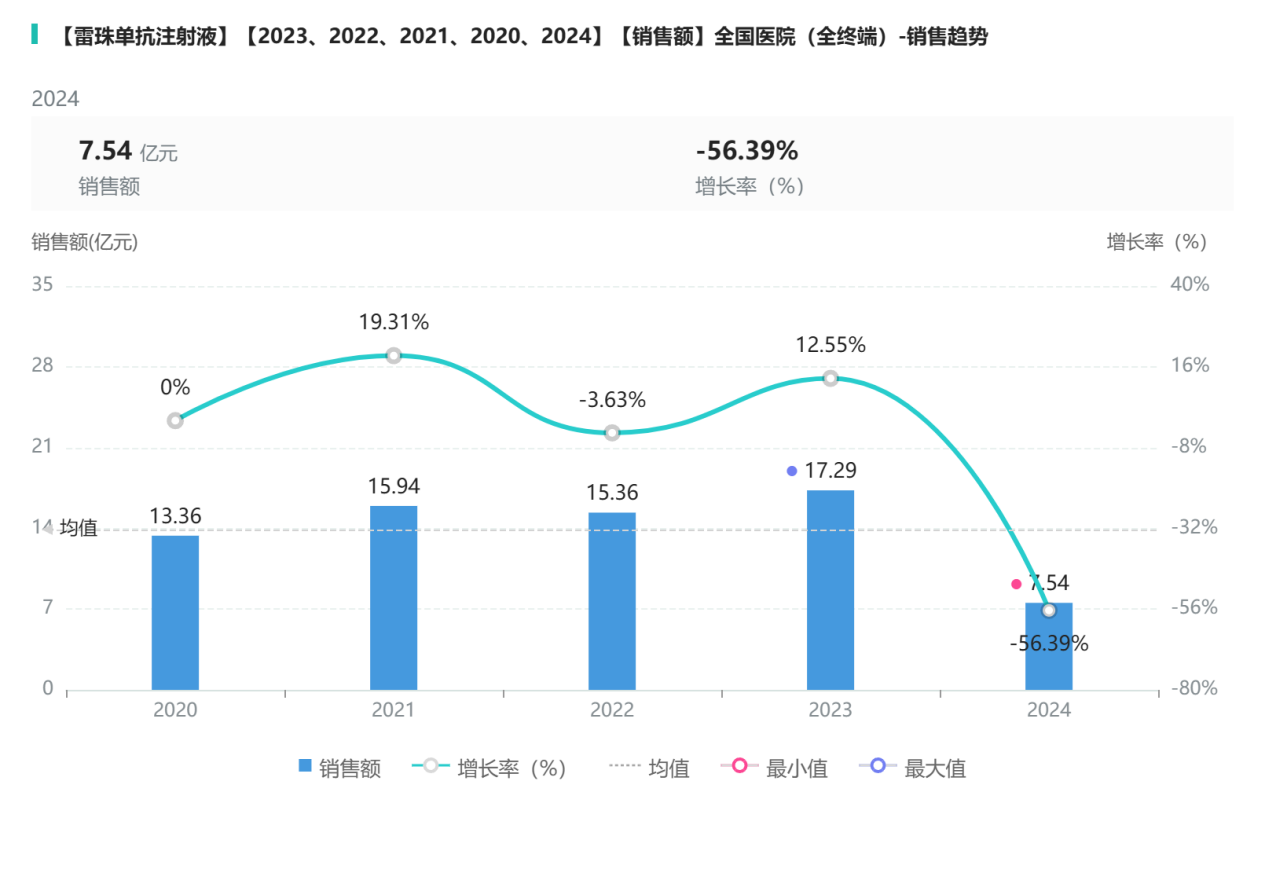 雷珠单抗注射液用于治疗湿性年龄相关性黄斑病变。在近4年间浮动较为稳定,据2024H1市场情况预测,预计2024年整年销售额或将低于2023年的17.29亿。