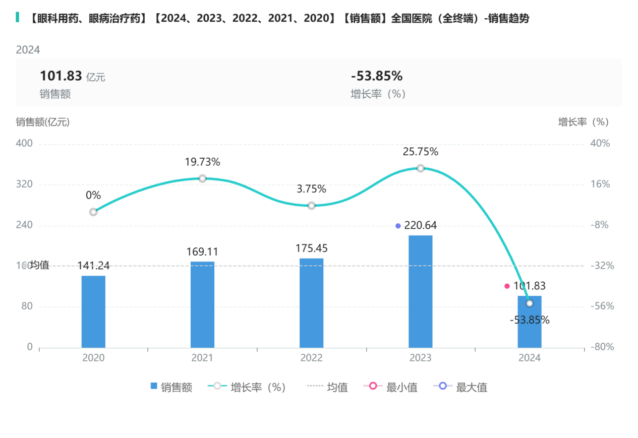 摩熵医药数据显示,2024年H1全国医院全终端终端眼科用药销售额超过百亿元。根据2020年-2023年总的市场情况来看,总体呈逐年稳定上涨趋势发展。相较于2022年销售情况,2023年增长率最高,为25.75%。据以上预估2024下半年增长速率将大于上半年。