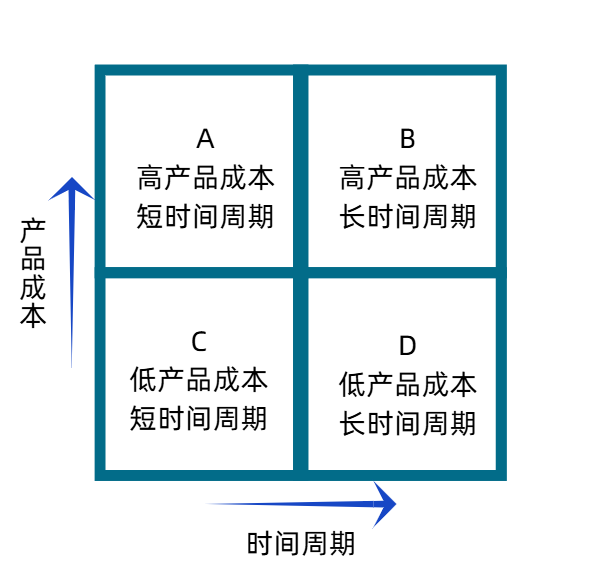 在评估成本时,时间周期是一个无法避开的维度。我们可以构建一个“产品成本-时间周期”的象限模型来辅助决策: