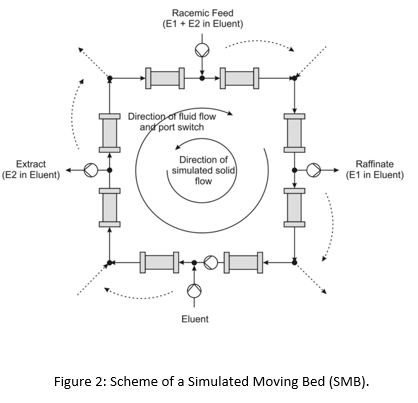 在处理难以通过结晶分离的手性化合物时,经典手性拆分往往伴随着巨大的损耗。如果在经典拆分中所需对映体的回收率仅有约45%(质量分数),通常会放弃从母液中回收残余产物。此时,SMB就成了一种极具成本效益的替代方案。
