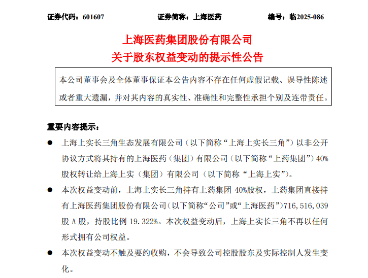 2025年9月24日,上海医药迎来了一次具有深远战略意义的内部股权梳理。上海上实长三角生态发展有限公司通过非公开协议方式,将其持有的上海医药(集团)有限公司(简称“上药集团”)40%的股权转让给上海上实(集团)有限公司(简称“上海上实”),转让价款总额高达人民币67.21亿元。