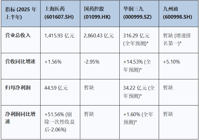 注:华润三九数据采用其2025年全年业绩快报数据,用以反映以OTC及中药为主的同业企业增长趋势;九州通数据反映部分研报披露的上半年增速情况。