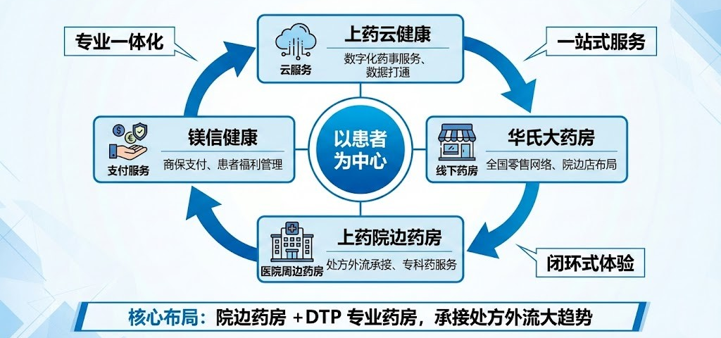 为了应对处方外流的大趋势,上海医药在2025年正式发布了“上药新零售一体化战略”。该战略依托旗下庞大的零售网络与成熟的供应链体系,深化批零协同,以“院边药房+DTP(直接面向患者)专业药房”为重点加速布局。公司通过物理整合与数据打通,将上药云健康、华氏大药房、上药院边药房、镁信健康四大核心业务板块融为一体,构建了真正意义上“以患者为中心”的专业一体化、一站式、闭环式新零售体系。这种闭环模式不仅提高了高价值专科药与罕见病用药的可及性,也为后续的数字化增值服务提供了绝佳的物理触点。