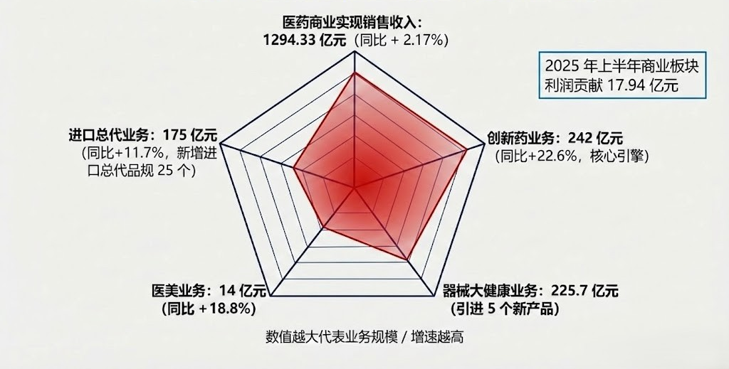 作为中国医药商业流通领域的领军者,上海医药的商业板块在2025年实现了高质量跨越。上半年医药商业实现销售收入1,294.33亿元,同比增长2.17%,利润贡献达17.94亿元。更为关键的是,创新药业务作为核心引擎,实现销售收入242亿元,同比暴增22.6%。器械大健康业务引进5个新产品,实现销售收入225.7亿元;医美业务也取得14亿元销售收入,同比增长18.8%。公司已彻底摆脱单一物流配送商的标签,转型为驱动全产业链价值流转的核心枢纽。