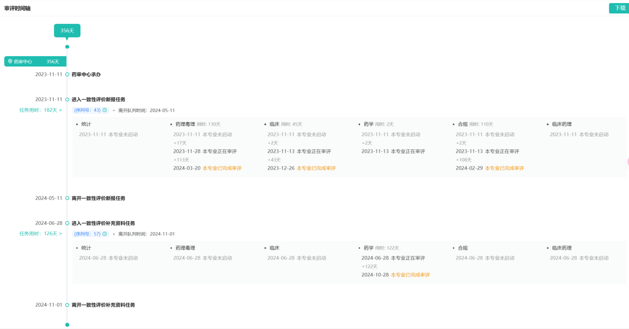 通过摩熵医药数据库查询其受理号,可看到氟哌啶醇注射液在2024年6月被提交补充申请,11月30号获得批准,并于11月1号离开一致性评价补充资料任务。具体评审全时间线可查看下图。