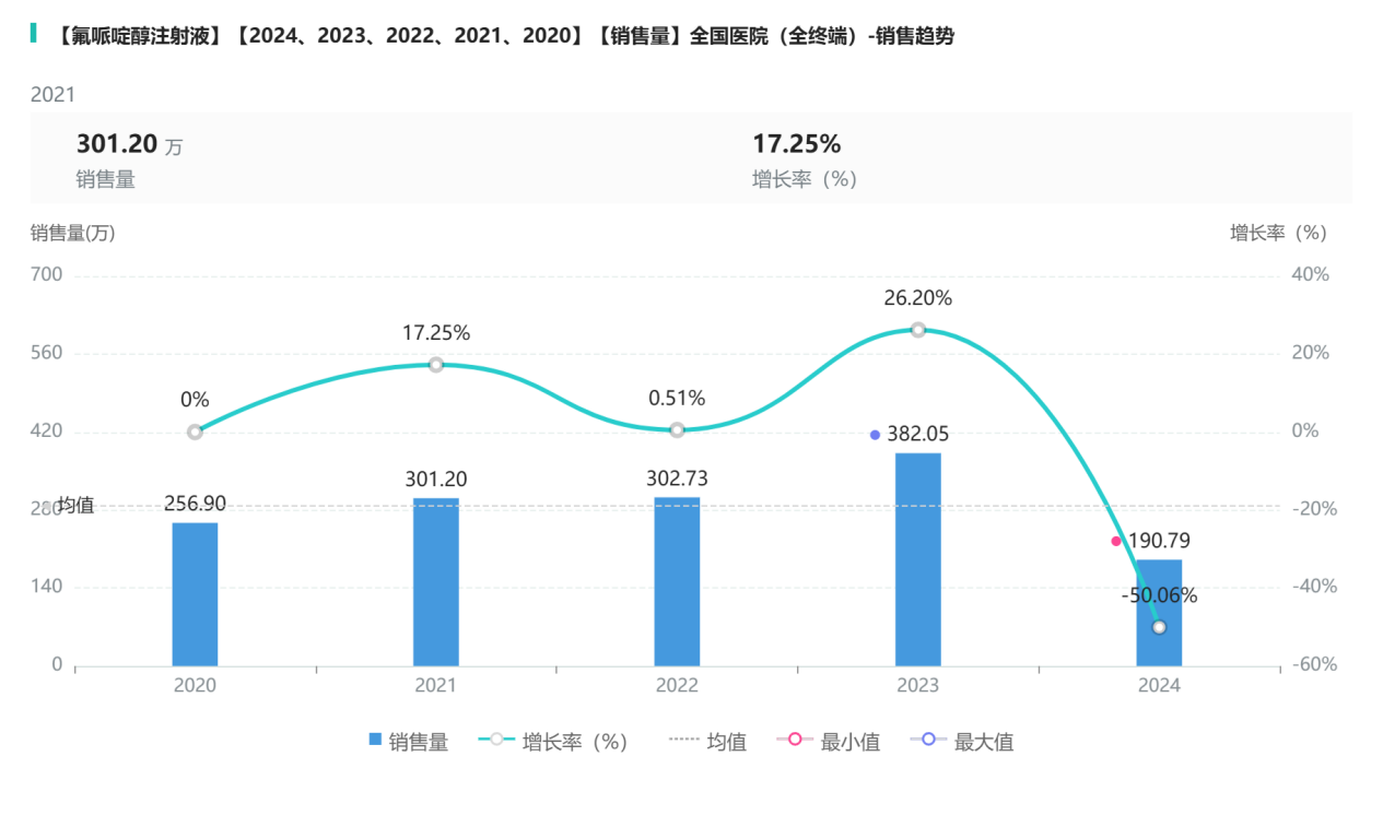 氟哌啶醇注射液用于急、慢性各型精神分裂症、躁狂症。肌内注射本品可迅速控制兴奋躁动、敌对情绪和攻击行为。也可用于脑器质性精神障碍和老年性精神障碍。观察其近年来销售量,呈逐年上升趋势,2024年上半年基本已达2023全年销售量50%,2024年整年销售量预计可与2023持平。